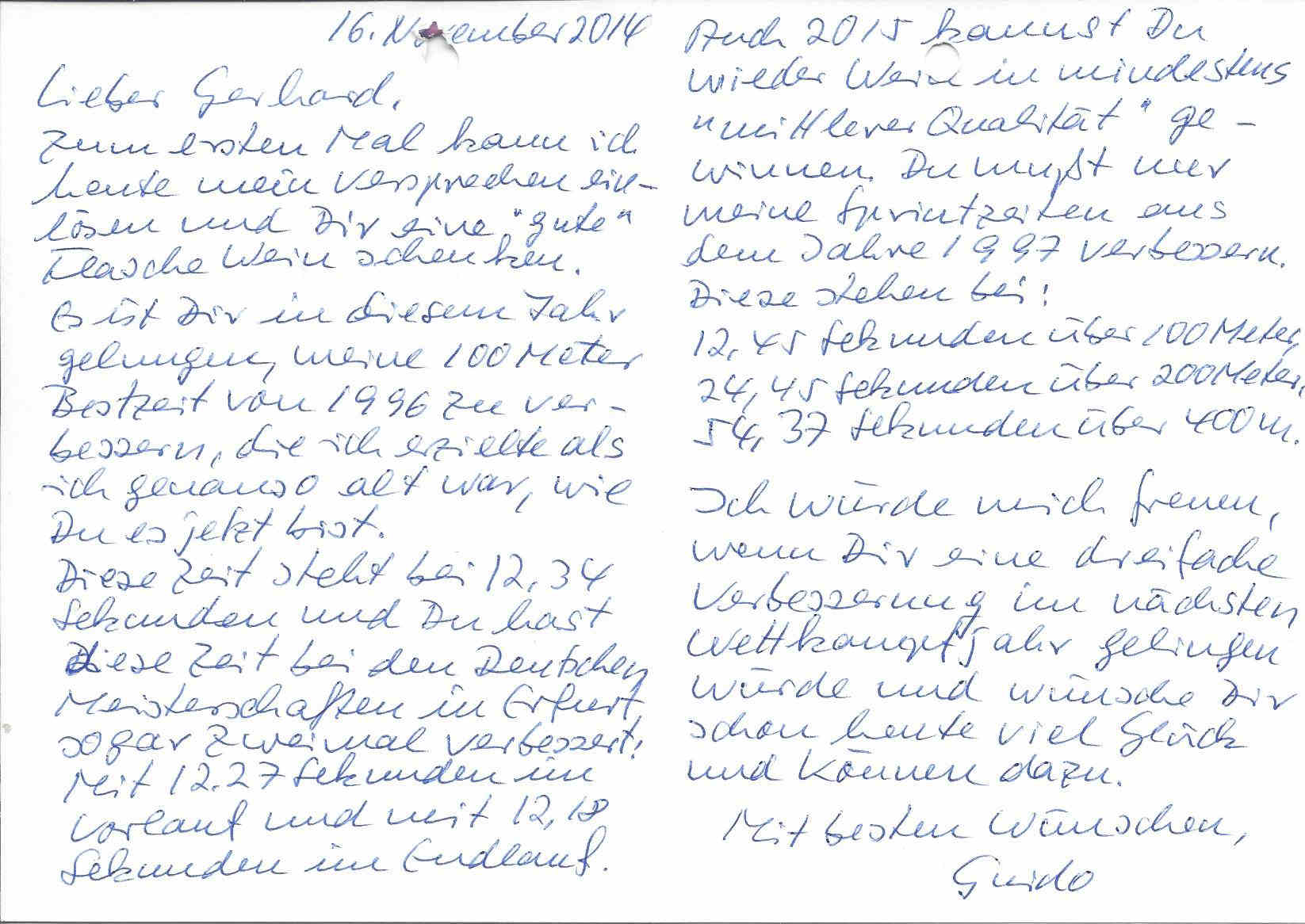 Viele Jahre teilte Guido mir seine jeweilige Jahresbestleistung über 100 m, 200 m und 400 m früherer Jahre mit. Verbunden damit war das Versprechen, mir eine gute Flasche Rotwein zu spendieren, wenn ich eine seiner Zeiten unterbieten würde, die er damals in gleichem Alter wie ich gelaufen war (siehe auch Bild weiter unten). Im Laufe der Jahre konnte ich es das eine oder andere Mal schaffen. Das Gute für mich war: Ich musste keine Gegenleistung erbringen, wenn ich seine Zeiten von früher nicht schaffte.